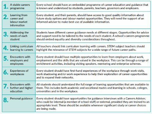 The eight Gatsby Benchmarks are the core dimension of good careers and enterprise provision in schools. They have a key role in raising young people’s aspirations and promoting access to all careers pathways, enabling all young people to develop the skills and outlook they need to achieve career wellbeing and underpin the DfE guidance to schools on meeting their statutory responsibility for careers guidance.