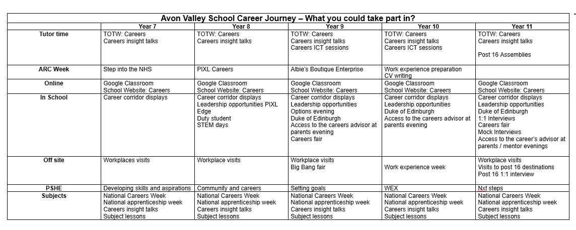 If you would like more information, or would like to organise a careers event, please contact Mrs Owen lowen@avonvalleyschool.uk for further information.